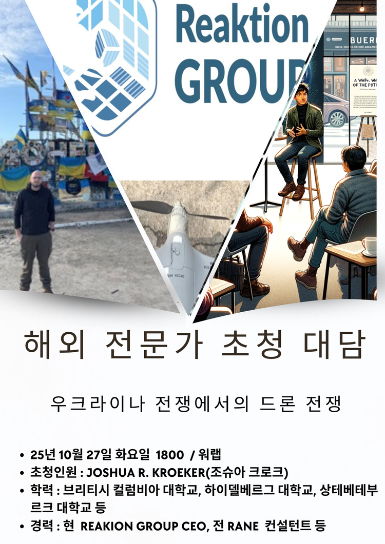 워랩(Warlab) 우크라이나 전쟁 전문가 만남의 밤 행사 일시 / 장소 : 10. 27.(월) 18:00 / 워랩(Warlab) <초청인사 인적사항>- 성명 : Joshua R. Kroeker(조슈아 크로커)- 직책 : “Reaktion Group”(리엑션 그룹) CEO * 참가비 무료