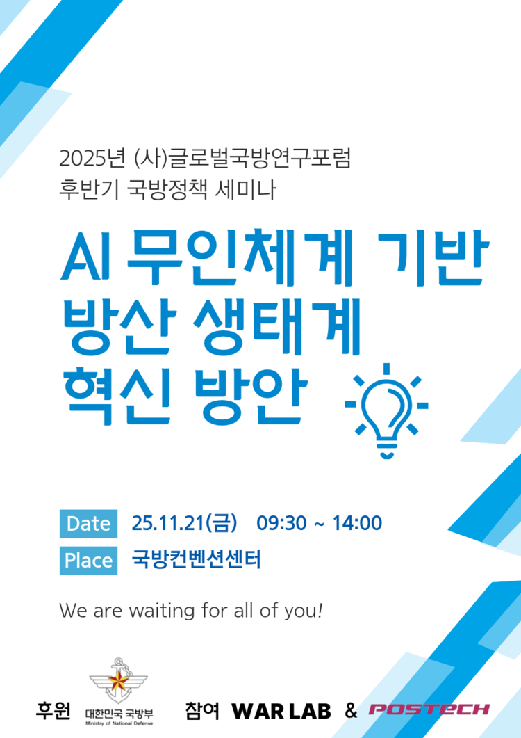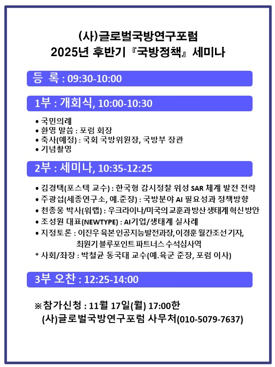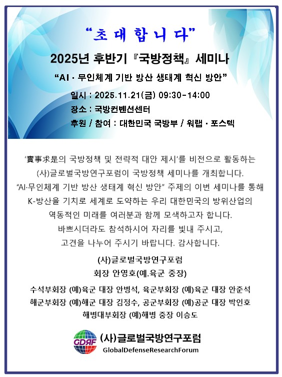 2025년 (사)글로벌 국방연구포럼 후반기 국방정책 세미나 (참가비 무료)